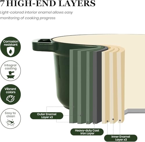 Expertly Made for Longevity: The Overmont enameled cast iron Dutch oven combines high-quality cast iron with a robust three-layer protective enamel coating. This construction includes a food-safe porcelain enamel glaze that provides superior resistance to chipping and cracking. The heavy-duty design of this Dutch oven pot with lid ensures long-term durability and reliability.
