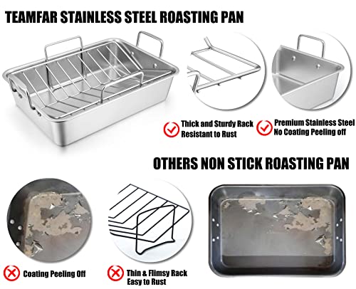 NO COATING PEELING OFF – TeamFar roaster pan and v roasting rack and cooling rack are constructed with well made stainless steel, No worries about coating flaking off, A great substitution of stainless steel for nonstick roasting pan, Healthier for baking use