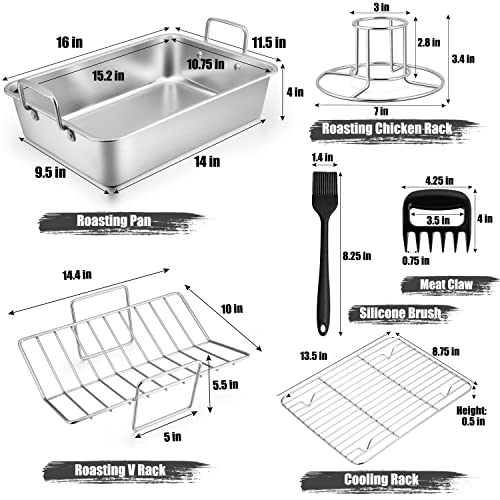 TeamFar Roasting Pan, Large Turkey Roaster Pan Stainless Steel with V Rack & Cooling Rack, Beer Can Chicken Holder & Meat Claws for Shredding & Silicone Brush, Healthy & Dishwasher Safe – 7 Pcs