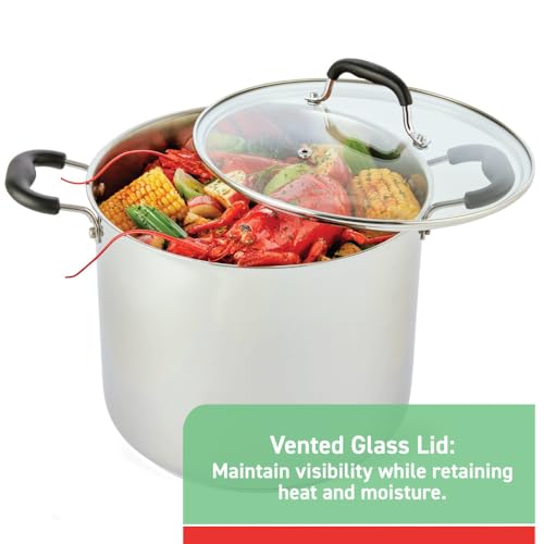 The T-fal Specialty Stainless Steel 12-qt. Stockpot is a stylish and functional addition to any kitchen. This stock pot features a tempered glass lid with a stainless steel finish and air vents that allows the steam to escape. The black silicone handles provide great strength and a firm support. The 3 ply aluminum construction distributes heat evenly to the cooking surface and prevents the formation of hot spots. It is compatible with gas, electric, and glass stove tops. The 12-qt. Stockpot has a capacity of 12 quarts and is dishwasher safe, enabling easy cleaning.