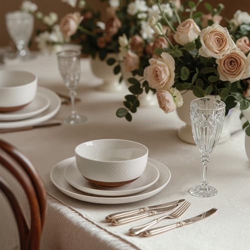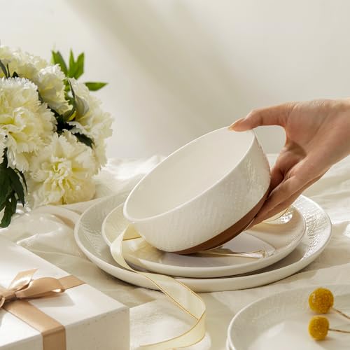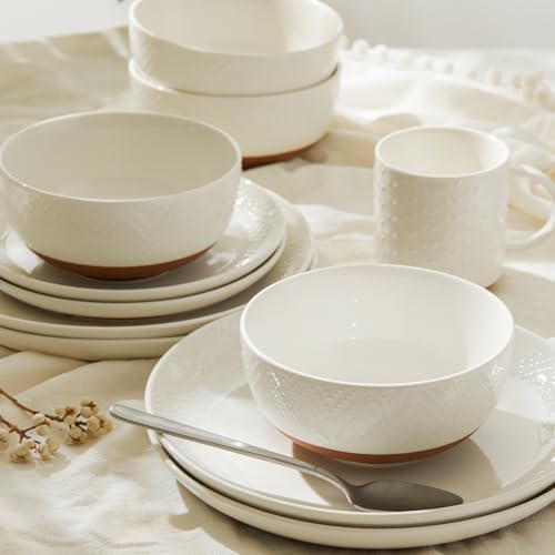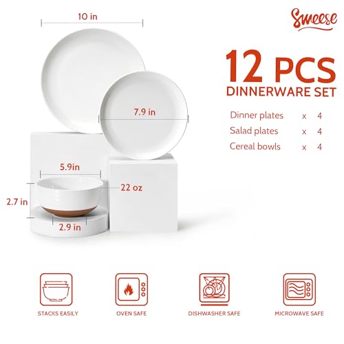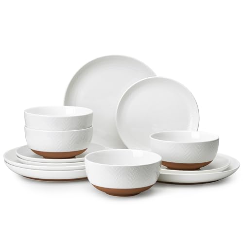 Sweese Porcelain Dinnerware Sets for 4, 12 Pieces Handcrafted Embossed Plates and Bowls Set with Rustic Terracotta Underside, Scratch Resistant Dishes Set, Dishwasher & Microwave Safe, White