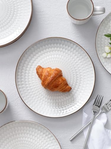 Famiware Eden Plates and Bowls Sets, Stoneware Dinnerware Sets with Gold Trim, 12 Pieces Dishes Set for 4 – Chip and Scratch Resistant, Microwave and Dishwasher Safe, White Circle