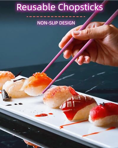 【Non-Slip Design】These reusable fiberglass chopsticks feature a non-slip design, providing a secure grip for beginners and adults or experienced users, Whether you’re enjoying sushi, noodles, or dumplings, they work great, enhancing your dining experience