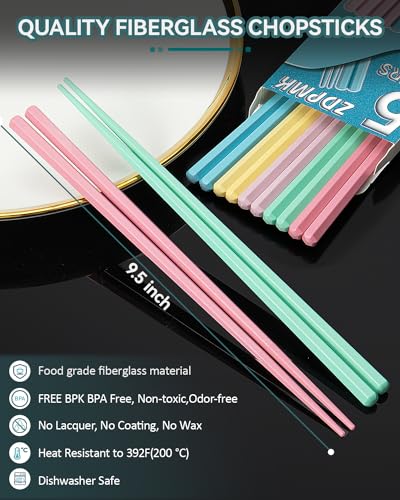 Fiberglass Chopsticks, 5 Pairs Reusable Chopsticks Dishwasher Safe, Japanese Chinese korean Chop sticks Set, Plastic Chop sticks Reusable for Beginners Adults, 9.5 inch Non-Slip Chop sticks