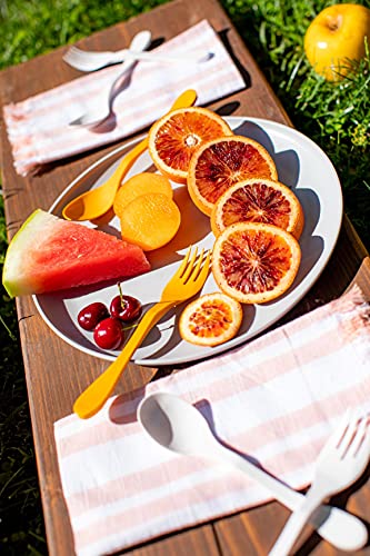 Made of bamboo fibers and sugar cane starch Plant Based Reusable Flatware Cleverly-designed (fork’s got beveled edges that let it double as a knife) – everything is made from sugar cane starch and bamboo fiber (no plastic here!) Sustain-ably sourced Set includes: 8 Eco white spoons and 8 Eco white forks 8 eco white knives Approx 6.75″each About the Astrik material: –Dishwasher-friendly, durable and reusable –Biodegradable by design – use and reuse. –We’ve safely tested our Eco utensils up to 200 degrees Fahrenheit in a commercial dishwasher, but prolonged exposure at higher temperatures than that is not advised (i.e. dishwashers with a “heavy duty” high heat wash cycle, using the utensils to stir or cut food directly out of the microwave or oven, which usually boast temperatures far higher than 200 degrees. However, just because a utensil becomes warped, it is not permanent. If you were to heat it up again, it woul