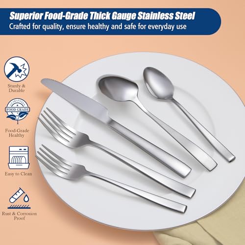 【Sturdy and Dishwasher Safe Silverware Set】The spoons and forks set is all made of premium thick-gauge stainless steel, rust resistance and corrosion resistant, nickel free, BPA free, no smell, which ensures you enjoy every bite of food safely. It has a 2-6 mm specification thickness, which is more durable than medium weight silverwear. Solid construction ensures that it will not bend easily providing you with long-term use. Easy clean and dishwasher safe