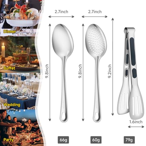 【Perfect Size】Our large serving utensils set is designed with proper size, featuring a nice thickness and weight that make handling comfortably. Serving spoon measures 9.8 inches, and serving tongs are 9.6 inches.