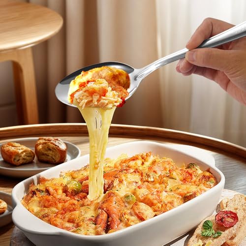 【Comfortable Design】Big serveware spoon features flat handles and elliptical-shaped spoon heads, serve various dishes with ease, serving tong also comes with heat-resistant design provide an ergonomic grip. Mirror-polished finish exude a modern aesthetic to complements any table setting.