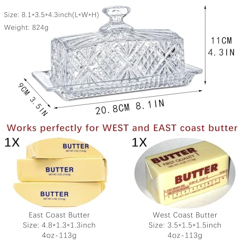 Crystal Covered Butter Dish,8inch Classic Glass 2-Piece Design Butter Keeper with Lid | Butter Holder | Dishwasher Safe