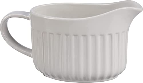 White dish features ribbed texture and includes handle and spout for easy pouring