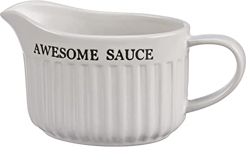 A stoneware gravy boat lending a debossed “Awesome Sauce” sentiment in slate gray. White dish features ribbed texture and includes handle and spout for easy pouring. Microwave, oven, dishwasher, and food safe. This item makes a perfect addition to a farmhouse aesthetic and coordinates well with other pieces in collection!