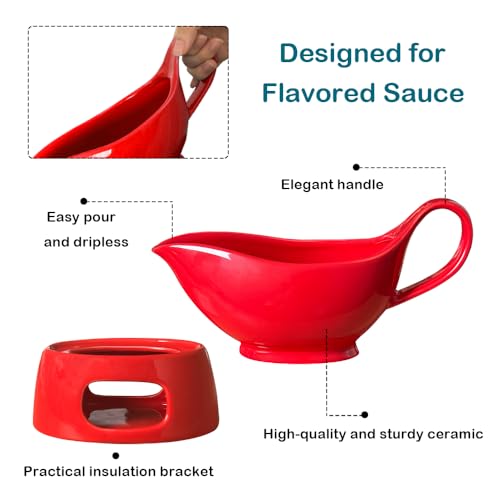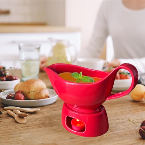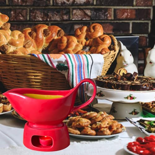 Qlans Porcelain gravy sauce boat with candle holder, 20 ounces, Used for turkey salad dressing, cream milk broth – Thanksgiving and Christmas dishes – Red