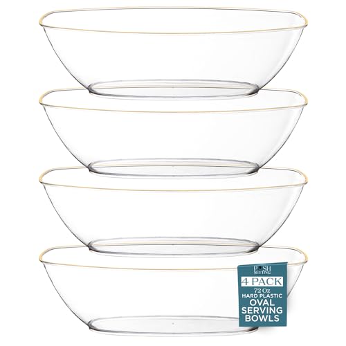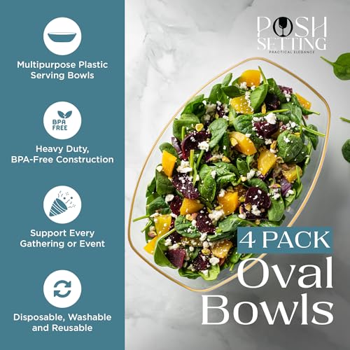 HEAVY-DUTY, BPA-FREE CONSTRUCTION – Our versatile oval serving bowls are made with a high-quality, lightweight, food-grade plastic that’s suitable for use in the kitchen, dining room, living room, buffet table, or wherever you’re serving up good times. These disposable serving bowls, clear plastic bowls, and gold bowls are ideal for any event.