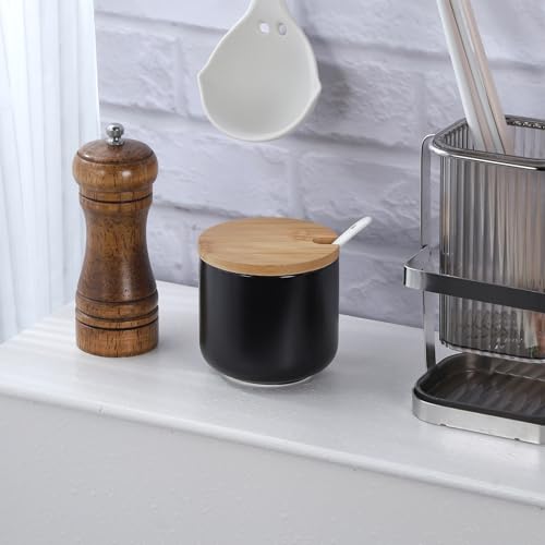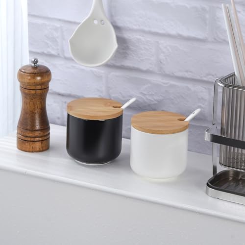 VanEnjoy Set of 2 Black Sugar Bowl with Lid 10oz Ceramic Sugar Bowl Salt Cellar with Lid and Spoon Salt Jar for Seasoning Sugar Container with Spoon