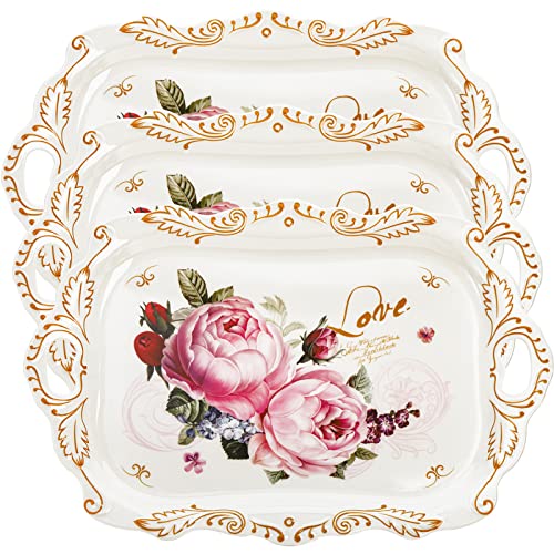 DEAYOU 3-Pack Melamine Serving Tray, Stackable Food Tray with Handles for Eating, Unbreakable Large Serving Platter with Floral Print for Gift, Party, Decor, Home, Restaurant, 16″L x 11″W, Rectangle