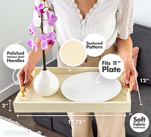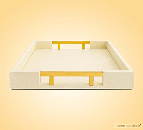 Modern Elegant 18”x12” Rectangle Cream Rectangle Shagreen Faux Leather Decorative Tray Ottoman Tray Coffee Table Perfume Living Room Kitchen Serving Tray with Gold Polished Metal Handles.