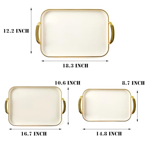 Serving Tray with Handles Set of 3 Rectangular Large Serving Platters 18.3/16.7/14.8 Inch White Plates for Dinner, Party, Entertaining, Cream Gold