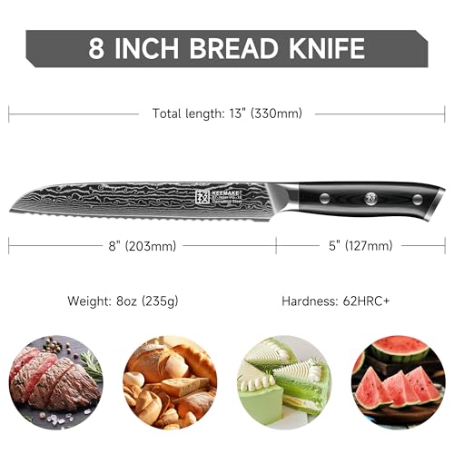 KEEMAKE Serrated Bread Knife, 8 Inch Japanese Damascus Kitchen Knife Wave Edge with G10 Ergonomic Handle, Cake Cutter Bread Slicing Knife for Sourdough Loaf Ciabatta