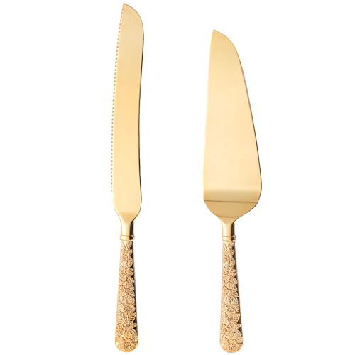 Dicunoy 2 PCS Gold Cake Knife and Server Set, Wedding Cake Cutting Utensils, Vintage Engraved Cake Cutter and Serving Spatula for Birthday,Anniversary, Vibrant Gold