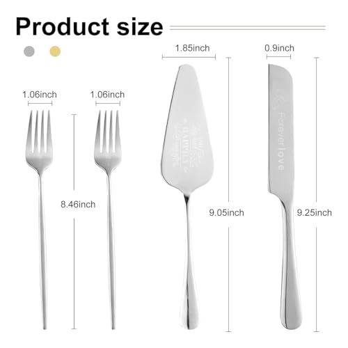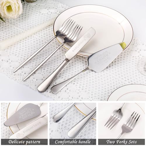 Personalized Cake Cutting Set for Wedding,4 Piece Wedding Cake Knife and Server set, Mr and Mrs Cake Cutter and Forks for Wedding, Birthday, Anniversary, Graduation Gift (Silver)