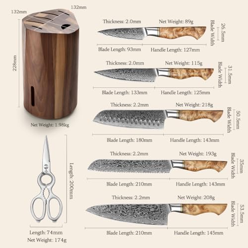 HEZHEN 7PCS Kitchen Knives Set – Professional Forging Damascus High Carbon Steel Chef Knife, Santoku, Bread, Utility, Fruit Knives & Multifunctional Kitchen Scissors – 6Slot Black Walnut Block
