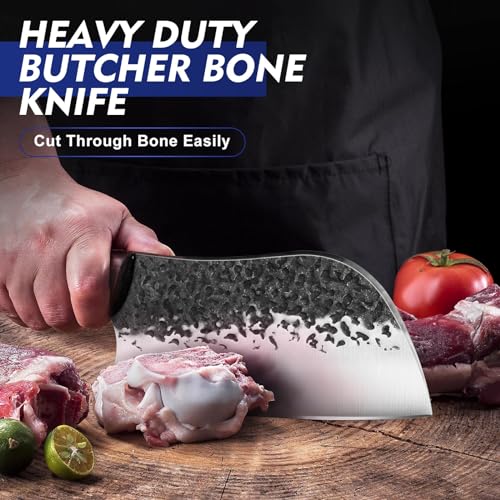 【Hand Forged Meat Cleaver】 These forged butcher knives are hand forged by craftsmen with more than 50 years of experience. Crafted from high carbon steel, our durable viking knife set boasts incredibly sharp blades. The chopping knife can be keeped the blade sharp for a long time, helping you cut food effortlessly. The oxidation blackening and hammering process add an anti-stick effect, enhancing the knife’s technical and aesthetic appeal. Warm Tip: Always Handwashing it!