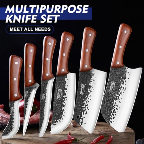 【Multifunctional Cleaver Knife Set】The Butcher Knife Set comprises a total of six knives for meat and vegetables. Include: Serbian Cleaver Knife, Meat Cleaver Knife, Butcher Knife, Carving Knife, Boning Knife, Fillet Knife, Sharpening Rod and a high-quality leather chef’s knife bag. Classified as a multi-function Kitchen knife set. Whether you’re cooking at home or outdoors, there’s something for you.