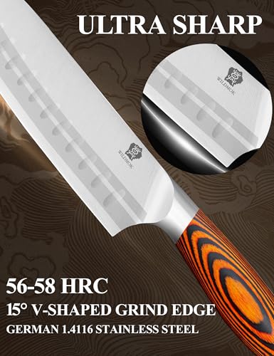 【Ergonomic Design Handle】Pakkawood handle for a durability yet balanced and comfortable grip. Every curve and angle of the handle is ergonomically designed for a comfortable and ambidextrous hold. The shape of the blade also brings you a minimal slicing resistance. Most importantly, excitement back to cooking.