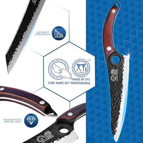 【High Carbon Steel Full Tang Blade】The XYJ knife features an ergonomic full tang design for improved stability and comfort. The handle is made from premium materials, providing durability and slip resistance for confident handling. The blade is forged using a stonewashed and hammer finish treatment, making it tough, wear-resistant, and non-sticking. Proper care is required for high carbon steel knives to prevent corrosion, but with regular maintenance, these knives will maintain their sharpness