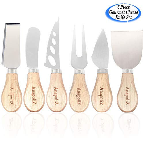 AnapoliZ Cheese Knife Set 6 Piece | Stainless Steel, Wooden Handles Knives | Narrow Plane Knife, Cheese Fork, Small Spade, Spreader, Shaver, Open Work Blade | Gourmet Cheese 6 pcs Knife Set