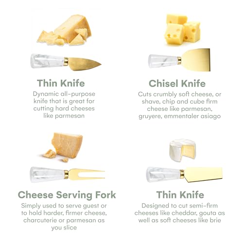 VERSATILE KNIFE SET: This comprehensive cheese knives sets are perfect for all your cheese and charcuterie needs. From soft brie to hard cheddar, our cheese knife set for charcuterie board handles every cheese type with ease