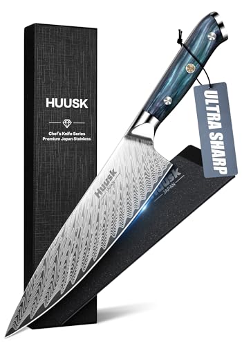 Huusk 8″ Chef Knife, Stainless Japanese Kitchen Knife with Ergonomic Resin Handle & Sheath, Sharp Kitchen Knife Full Tang, Japanese High Carbon Steel Cooking Knife, Gift Box for Men Chef Christmas