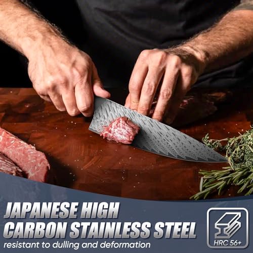 Japanese High Carbon Stainless Steel: Crafted from premium Japanese high-carbon stainless steel, this 8-inch kitchen chef knife brings strength and resilience to every slice. Its robust blade design delivers precision cuts, making it ideal for slicing, chopping, and dicing a variety of ingredients with ease and reliability.