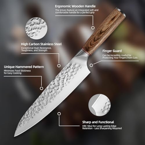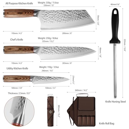 Effortless Cutting with BBQ Knife Set: Our hand-polished blades with HRC 58 hardness and a precise 14°-16° cutting angle glide through food with ease. The unique hammered pattern on this chef knife set with bag reduces stickiness, making it ideal for a bbq knife set or meat knife carving