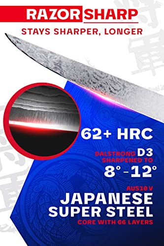 Dalstrong Power: Ultra sharp AUS-10V Japanese super steel cutting core at 62+ Rockwell hardness for extraordinary performance and edge retention. 67 layers of premium high-carbon stainless steel for exceptional strength, durability and stain resistance. Perfectly balanced, the precisely tapered blade minimizes surface resistance and curves inward to maneuver close to the bone, ensuring separating bone and meat is ultra efficient, while the fine tip gets in between joints.