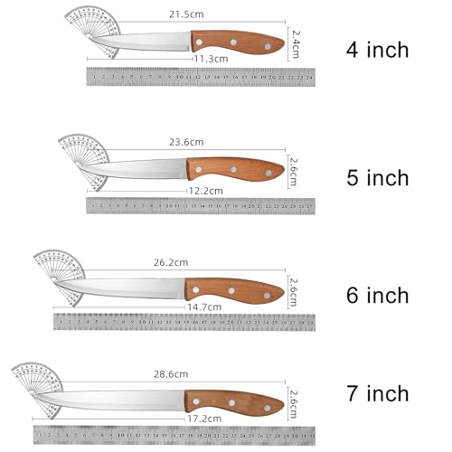 4 inch Knife-It’s a small and lightweight Paring knife,The knife can be held on hand comfortably,It has wooden ergonomic handle,anti-slippery,delicate manufacturing process make the handle looks elegant and sturdy.It matches your kitchen well.