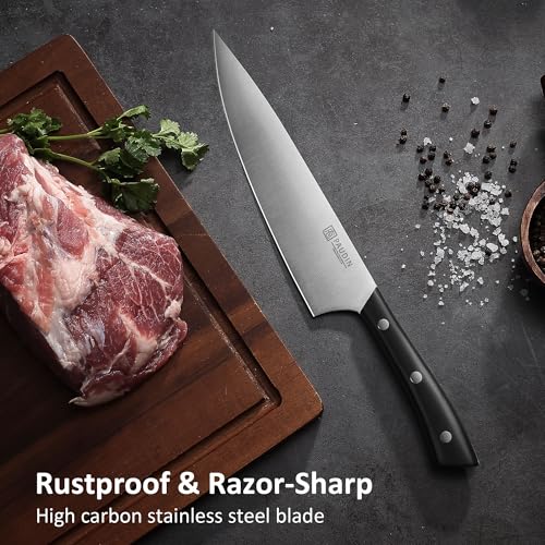 GERMAN STAINLESS STEEL: Made from high-carbon 1.4116 German stainless steel, these rust-resistant blades handle all kitchen tasks with precision. Satin-finished for durability and effortless cutting.