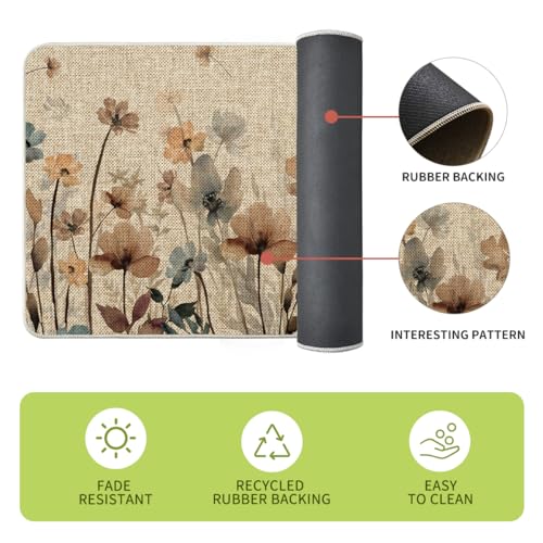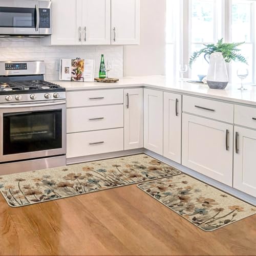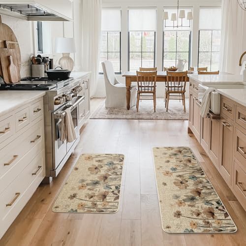 Artoid Mode Brown Poppy Floral Leaves Spring Kitchen Mats Set of 2, Spring Home Decor Low-Profile Kitchen Rugs for Floor – 17×29 and 17×47 Inch