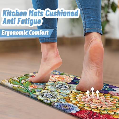 Boho Floral Kitchen Rugs Mats for Floor 2 Piece Memory Foam Padded Kitchen Mats Anti Fatigue Non Slip Cushioned Comfort Standing Mat, 17.3×28+17.3×47 Inch