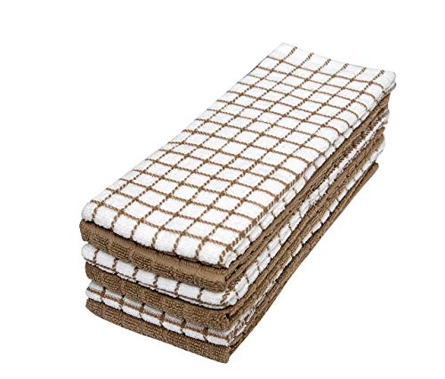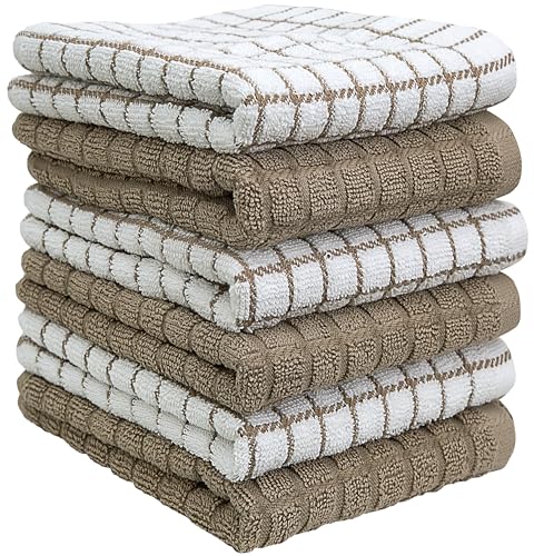 Kitchen Towels 16″x 28″ | Dish Towels | Kitchen Hand Towels | Large Dishcloths Set | Highly Absorbent Tea Towel, Soft with Hanging Loop | Natural Ring Spun Cotton, 380 GSM | Tan Check Design – 6 Pack