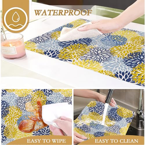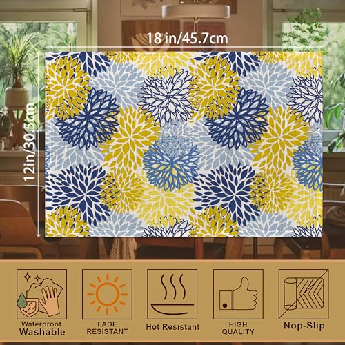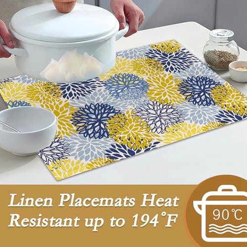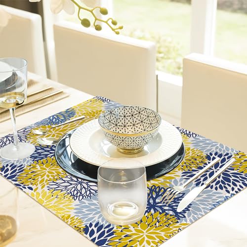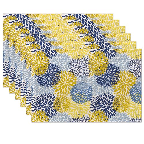 6 Pcs Yellow Blue Dahlia Table Mats,Floral Geometric Placemats Waterproof Washable, Kitchen Table Decoration Placemats Modern Holiday Kitchen Table Decoration(12″x18″Linen)