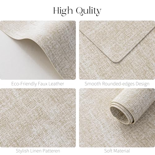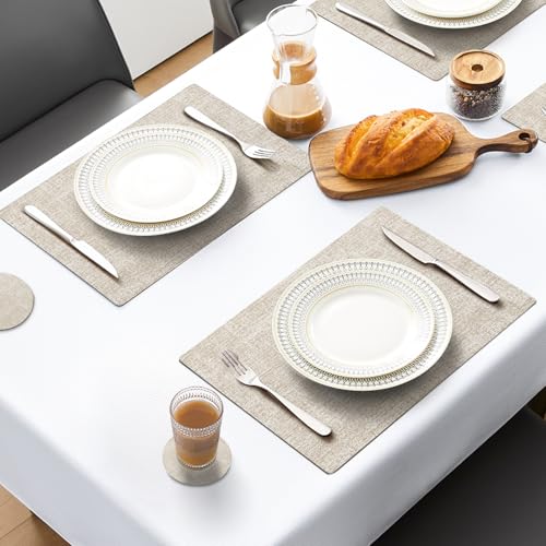 MOSAYT Faux Leather Placemats Set of 6, Heat Resistant Wipeable Washable Vinyl Place Mats with Coasters, Waterproof Oil Proof Table Mats for Kitchen Dining Party Indoor Outdoor, 12″ x 18″, Beige