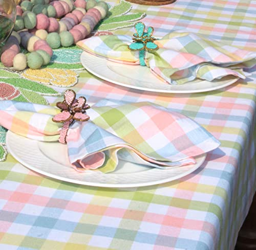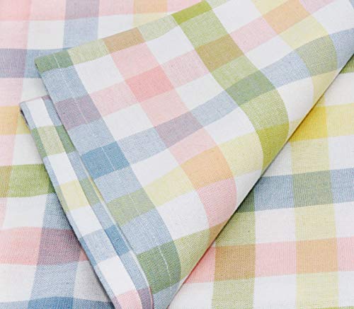 SET CONTENTS: Includes one pure cotton tablecloth, plaid including colors yellow, light green, white, pink, and blue measuring 60 inches x 120 inches finished with a 0.5 inch hem and mitered corners.