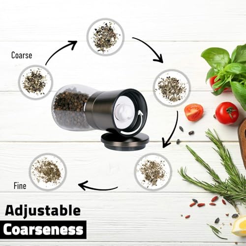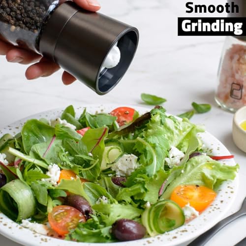 ✅ PERFECT SIZE AND EASY REFILLABLE – With its 5.5 oz capacity our salt and pepper mills set is not too large and not too small. The perfect size to avoid constant refills. When empty, the glass bottle will show (unlike wood grinders) and is EASILY unscrewed and REFILLED due to a wide opening. The grinder is 5.3” high. The glass jar will hold plenty of your favorite spices like Himalayan pink salt and peppercorn. No batteries, just a couple of effortless manual turns to get your fresh spices!
