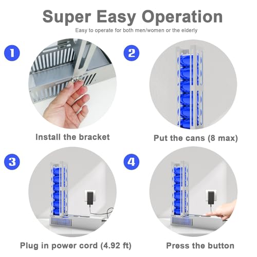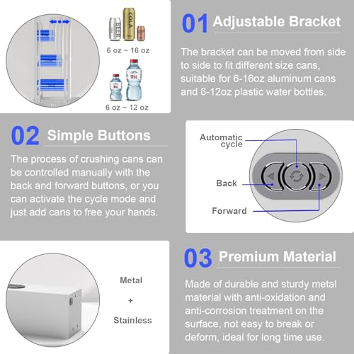 SUITABLE FOR 8oz~12oz~16oz CANS: The bracket with easily adjustable spacing provides more possibilities for this automatic electric can crusher. It can not only crush the most common 12oz cola can, but also be used to crush 8oz mini soda cans and 16oz big beer cans; It can crush cans with a maximum outer diameter of 3.3 inches and a height of 7.2 inches