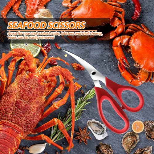 Premium Material: Crab crackers are made of die-cast zinc alloy, anticorrosive and more sturdy. Non-slip handle design seafood scissors are sharp to cut and open up the back vein of shrimp. Lightweight plastic lobster shells can crack and peel all legs and claws.