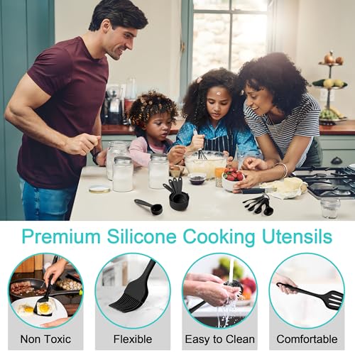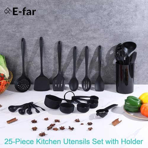 E-far Silicone Cooking Utensils Set, 25 Piece Kitchen Utensils with Holder, Non Toxic Kitchen Tools Spatula, Turner, Spoon, Ladle for Nonstick Cookware, Heat Resistant & Dishwasher Safe – Black
