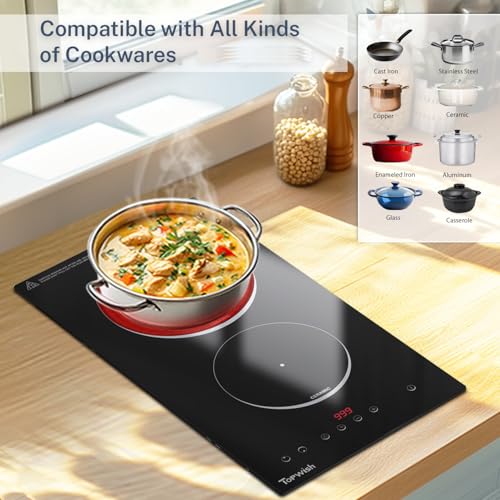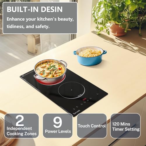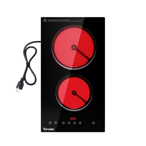 Double Burner Electric Cooktop: The Topwish electric cooktop boasts 2 independent cooking zones, each powered by high-performance burners of 1000W & 800W, ensuring rapid heating and swift cooking. With a total of 9 power levels to choose from, you can easily cook, simmer, steam, slow cook, and stir fry