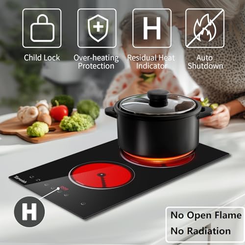 Safe and Harmless Plug-in Electric Stovetop: The 12″ electric cooktop has a variety of protection functions to ensure safety use, such as the child safety lock, 0-120mins timing setting, auto shutdown protection, residual heat warning, and overheating protection. No open flame, no electromagnetic radiation, you can rest assured to buy and use our electric ceramic stovetop