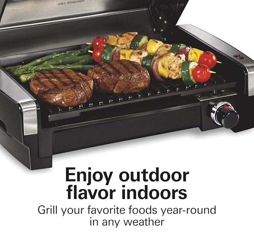 Hamilton Beach Electric Indoor Searing Grill with Adjustable Temperature Control to 450F, 118 sq. in. Surface Serves 6, PFAS-Free Removable Nonstick Grate, Stainless Steel (25360)